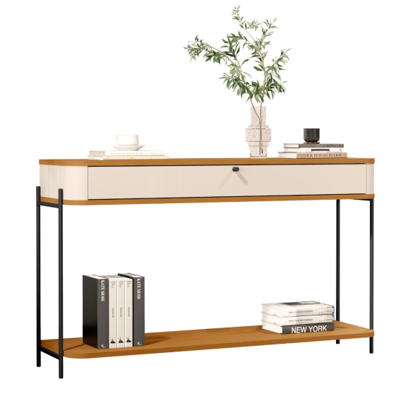 Descrição O aparador tucupí tem os cantos arredondados exclusivos da linha, base e tampo em MDF de 15mm, gaveta em MDF de 15mm com corrediças telescópicas além dos pés e puxadores em metal com design exclusivo.