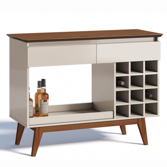 A montagem é de responsabilidade do comprador. Apesar de simples e acompanhar manual de montagem, recomendamos que a mesma seja realizada por um profissional ou empresa especializada. Imagens meramente ilustrativas.Material MDF/MDP Marca Imcal Estilo Moderno Prateleiras . Número de Gavetas 2 Gavetas Tipo de Corrediça da Gaveta Telescópica Adega Para 12 Garrafas Tampo Em MDF de 25 mm Pés Em Madeira Maciça Altura 87,5 cm Largura 1,13 m Profundidade 41 cm Itens Inclusos Manual de Montagem