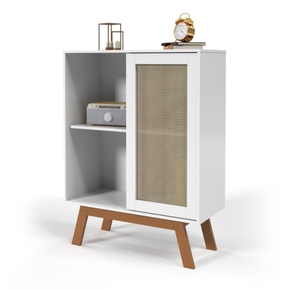 Balcao Alto Aparador Buffet com Porta de Correr Rattan pés em Madeira Branco Ofertamo