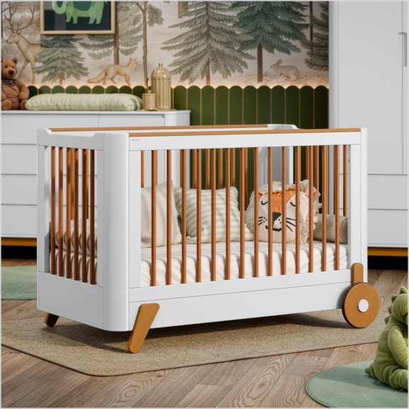 Fabricado com grades em palito de madeira, rodas em madeira e acabamento laqueado branco soft com detalhes Eco Wood, o berço traz sofisticação e resistência. O estrado possui 3 regulagens de altura, acompanhando o crescimento da criança de forma segura.