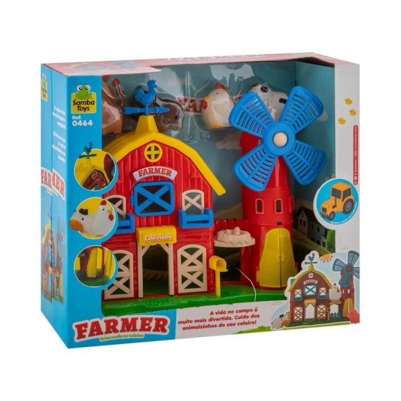 O Playset Celeiro da Samba Toys é o presente perfeito para estimular a imaginação e o desenvolvimento das crianças. Composto por 5 peças (1 Celeiro e 4 bichinhos em vinil). Projetado com atenção aos detalhes, o Celeiro é mais do que apenas um brinquedo, é uma experiência completa que transporta os pequenos para um mundo de diversão e aprendizado. Com design vibrante e colorido, o celeiro de brinquedo vem acompanhado de quatro adoráveis bichinhos de vinil: 1 porquinho, 1 vaquinha, 1 cavalo e 1 galinha. Cada animalzinho é cuidadosamente detalhado para capturar a essência da vida no campo. Com um moinho de vento que gira, as crianças podem explorar e entender conceitos básicos de energia e movimento de forma lúdica e envolvente. A portinha que abre e fecha adiciona um elemento de surpresa e descoberta, permitindo que os pequenos criem histórias e cenários em torno da fazenda.\n\nIdade recomendada:2-4 anos;Composição/Material:Plástico;Funciona com pilhas:Não;Brinquedo com luz:Não;Brinquedo com som:Não;Dimensões:37,7x43x15 cm;Peso:0,848 kg;Código de Barras:7908759404908;Garantia do Fornecedor:3 Meses contra defeito de fabricação;
