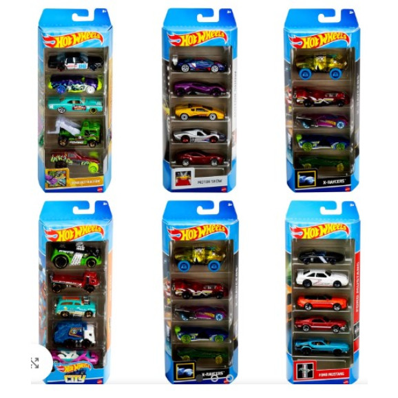 Descrição A coleção Speed into an instant Hot Wheels® traz conjuntos com cinco veículos de corrida cheios de detalhes. Os pacotes com 5 carros Hot Wheels® oferecem cinco vezes mais ação e são perfeitos para fãs de carros de todas as idades. Cada kit traz um tema interessante, detalhes autênticos e enfeites atraentes, o que os torna ótimos presentes para crianças e colecionadores. Escolha entre os temas X-Raycers™, Track Builder, HW Hot Trucks™, HW Exotics™, Nightburnerz™, Snow Stormers e muito mais. Com o realismo das rodas, pintura e demais detalhes destes carrinhos, a aventura e a imaginação não têm fim.