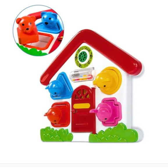 A casinha é colorida, leve e super interativa! Com um espelho verdadeiro na porta, figuras geométricas de bichinhos para encaixar, tambor que faz som com bolinhas e campainha com luzes piscantes e 3 músicas infantis clássicas.