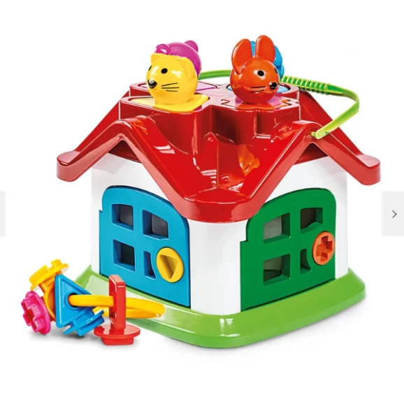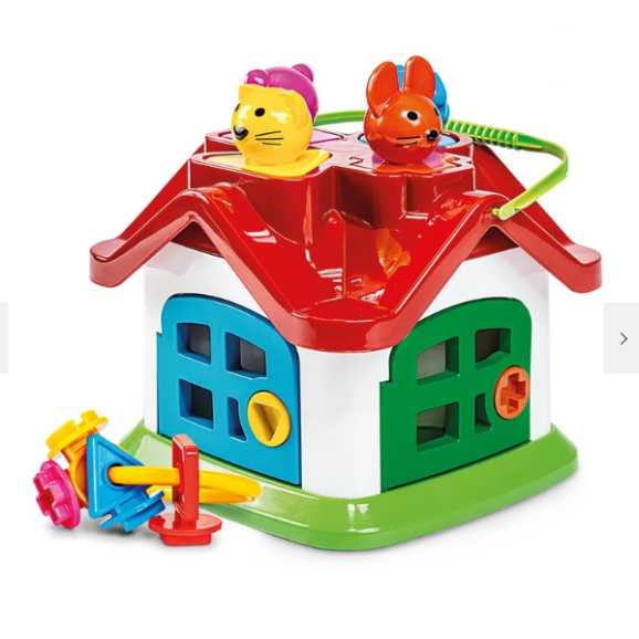 Os bichinhos são também figuras geométricas que se encaixam nos orifícios do telhado, que quando posicionados corretamente entram na casinha. Ficam esperando que a porta seja aberta para reiniciar a diversão! E agora? Qual será a chave?