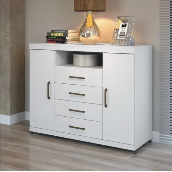 A Cômoda Master possui design contemporâneo e dinâmico, que pode deixar o cômodo bem mais moderno e funcional. Sabe como? Graças aos detalhes que fazem toda a diferença! Sim, essa cômoda para quarto possui 2 portas sendo uma em cada extremidade, 4 gavetas com corrediça metálicas, amplo espaço interno e nicho central com passa fios para aparelhos eletrônicos, itens decorativos ou objetos pessoais. Ah, e fabricado em MDP com acabamento envernizado e puxadores em ABS para conferir durabilidade e resistência. Ah, e ainda possui rodízios para facilitar a locomoção do móvel. Nossa, com tantos benefícios assim fica difícil recusar né?