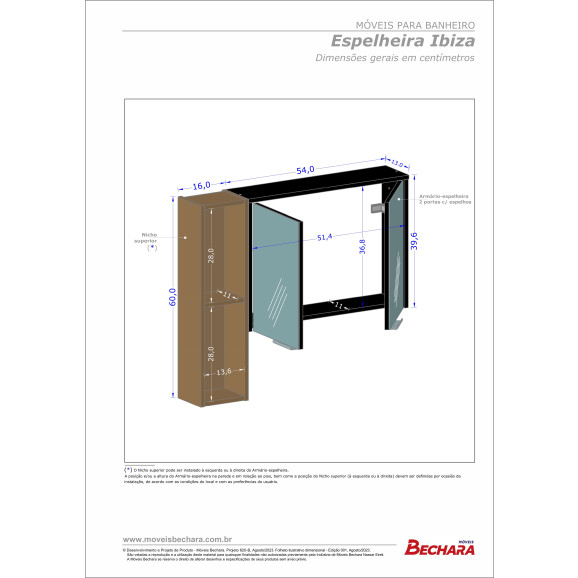 A Espelheira Ibiza foi cuidadosamente projetado para combinar elegância com funcionalidade. Alem de ser robusta e muito funcional, ela conta com nicho lateral que pode ser instalado do lado direito ou esquerdo do produto. Portas com amplos espelhos, e com muito espaço interno! Puxadores em alumínio anodizado garantem ao produto um toque de requinte e sofisticação.
