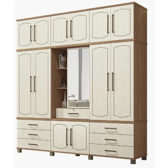 O Guarda-Roupa Londres Capelinha além de muito bonito, possui todas as funcionalidades para atender a necessidade de espaço e organização, além de sua praticidade. Suas 13 portas em MDF, que garantem espaço suficiente para guardar todas as roupas: como camisas, vestidos, roupas íntimas, sapatos, decoração, etc. As 7 amplas gavetas com corrediças telescópicas proporcionam uma abertura completa e ainda ajudam a suportar mais peso. Ah, e uma delas possuem chaves, para guardar algo de mais valor com segurança! Possui penteadeira na parte central, com espelho na medida: 97 x 45 cm, cabideiros metálicos para pendurar as roupas com organização. Os puxadores são em alumínio, garantindo mais beleza, durabilidade e praticidade no abrir e fechar das portas e gavetas. Os pés são em madeira de Pinus de 50 mm, pintado. E o melhor de tudo nesse guarda-roupa é o motivo dele ser TRIPLEX... ele é montado em 3 partes, assim, quando precisar mudar de local, é só carregar em partes, sem precisar desmontar. Prático né!? O acabamento na cor madeirada é com verniz fosco, tudo dentro dos padrões de preservação do meio ambiente. Se procura por espaço para o seu quarto de casal, esse roupeiro pode te atender perfeitamente! -