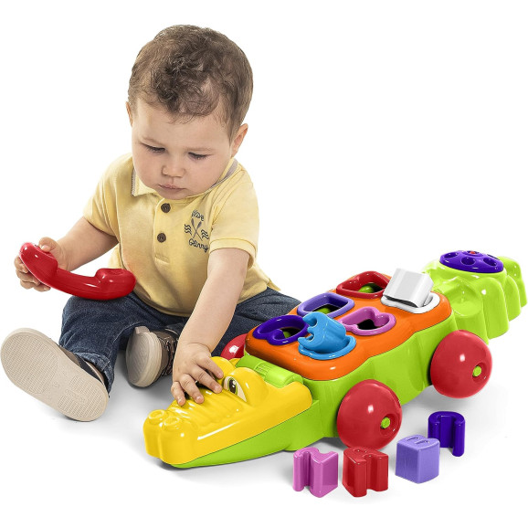 Mas ensina o A B C, abre e fecha a boca para guardar as pecinhas e ensina a contar até três. Cores e formas didáticas que despertam a curiosidade dos pequenos. Formas de encaixe e interações que estimulam cognitivo e noções de cores, formas e tamanhos. Ah, ele também tem rodinhas e um telefone com discador para brincar de montão!