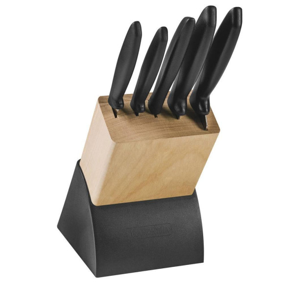 Jogo de facas Tramontina 6 peças com CepoVocê vai impressionar seus convidados com o jogo de facas Tramontina Plenus com lâminas em aço inox cabos de polipropileno preto e suporte de madeira 6 peças da linha Plenus. São cinco peças produzidas com cabos na cor preta de polipropileno e lâminas de aço inox, resistentes e fáceis de manusear, podendo ser levadas à máquina de lavar louças. Versáteis e com design moderno, se encaixam em diferentes usos. Podem serem usadas desde preparações mais simples até mais elaboradas. O jogo de facas é a escolha ideal para embelezar ainda mais o seu ambiente!