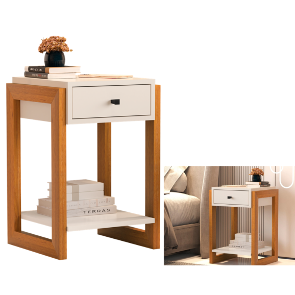 A mesa de cabeceira 1661 é mais um lindo lançamento da marca Ofertamo,com um design moderno, ela vem unindo sofisticação, charme e beleza em um só produto.Ela conta com 1 gaveta com corrediças telescopicas, sapatas plasticas anti-umidade e puxadores em PVC.Sua estrutura interna é em MDP de 15mm e sua base de sustenção lateral é em madeira Pinus de 22mm, propocionando maior durabilidade e qualidade do produto.