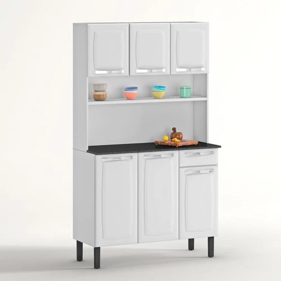 Armário de cozinha com 6 portas e 1 gaveta, oferecendo funcionalidade e elegância. Conta com tampo de 15mm MDP FF revestido no padrão granito, proporcionando um acabamento sofisticado e resistente. Corpo e portas com pintura eletrostática em pó para maior durabilidade e estilo. A gaveta possui corrediça telescópica para deslizamento suave. Puxadores em PS complementam o design moderno.