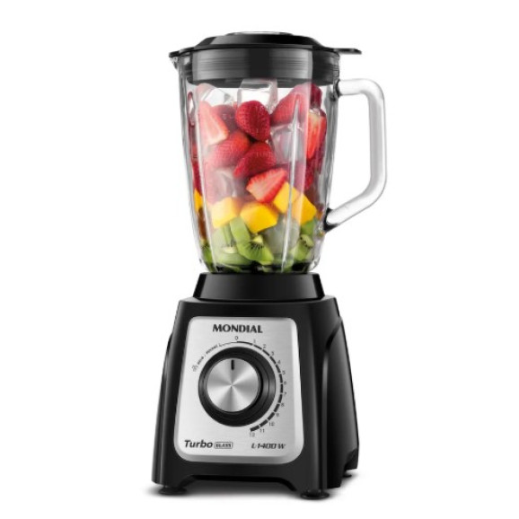Descrição O Liquidificador Mondial Turbo Glass L-1400-GI é perfeito para dar um toque de sofisticação à sua cozinha. A jarra de vidro, além de ser resistente a variadas temperaturas, sem absorver odores ou manchas, possui um design superelegante e exclusivo. O liquidificador tem a superpotência de 1.400W e garante um desempenho excelente no preparo das receitas. Conta com 12 velocidades, 6 lâminas em aço inox e faca removível. Saiba mais sobre o L-1400-GI: