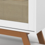 A mesa de cabeceira conta com porta deslizante de rattan sintético, embelezando ainda mais o produto.