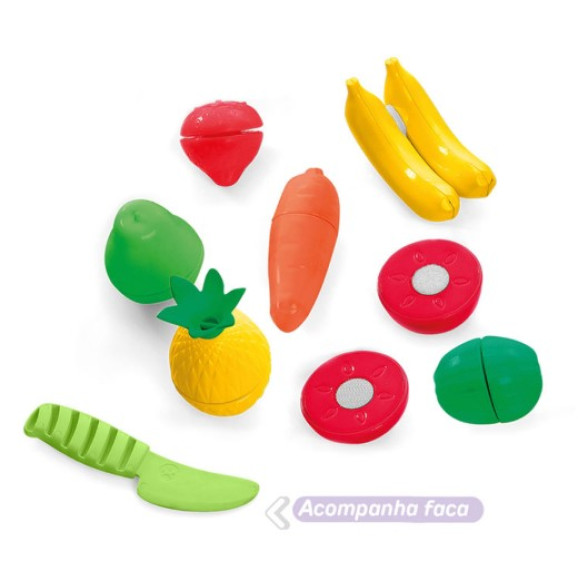 Sopa de legumes ou salada de frutas? A Nutri vem com uma variedade de itens para brincar e aprender com os alimentos. Cebola, chuchu, pimentão ou cenoura, tem também o pepino. E para quem tem outra vontade é só escolher entre abacaxi, carambola, maçã, tomate, morango, melancia, pêra, pêssego ou banana. Todas as escolhas prometem diversão pra semana. As frutinhas e verdurinhas vem com velcro para divertir com o creck-creck, o barulhinho com gostinho de infância. Acompanha: 7 Miniaturas de frutas e verduras com velcro (sortimento de frutas e verduras) 1 Faca Dimensões da Embalagem: Altura: 15cm Largura: 19cm Profundidade: 11cm
