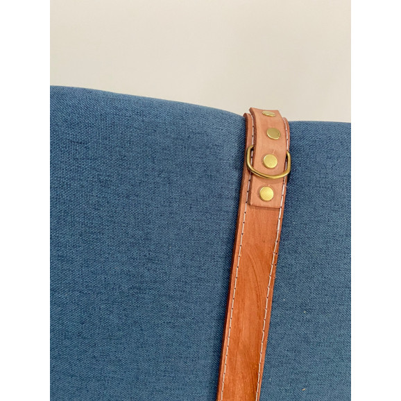 Painel Cabeceira Casal 1,40 Linho Azul Cinta Em Couro Ofertamo