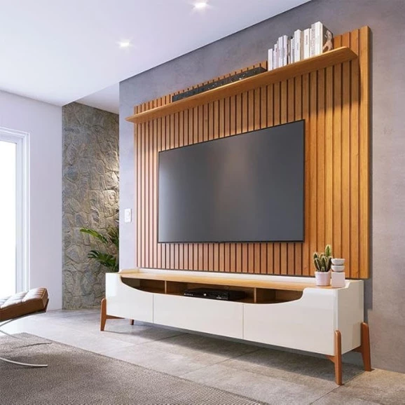 Com painel ripado e acabamento sofisticado, valoriza o ambiente e traz mais organização.